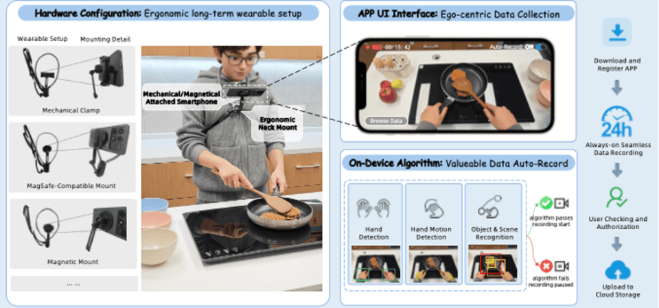 近日,具身智能真实数据采集技术取得重要突破。由蚂蚁数科天玑实验室团队研发的AoE(Always-On Egocentric)持续性第一人称视频采集框架,提出了一种轻量化且低成本的具身数据采集方案。通过一台手机和一个低于 20 美元的颈挂式支架,就可以替代动辄数万美元的专业设备,实现具身智能的高质量数据采集。该技术方案的提出,有效化解了具身数据采集成本高、规模化难的困局。目前,这一技术论文已经在 Arxiv 发布。