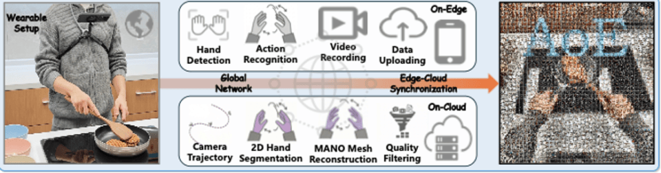 低成本采集只是起点。据论文介绍,蚂蚁数科攻克了“长视频转化为训练数据”的技术难题:该方案通过端侧轻量级视觉模型自动识别手物交互并触发录制,利用大语言 - 视觉模型将连续视频切分为带语义标签的原子动作片段,最终经云端自动标注、过滤与清洗,让手机录制的视频自动转化为高质量、标准化的训练数据。