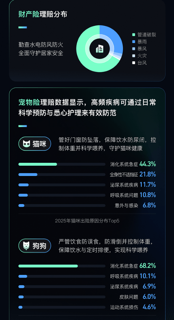 2025年腾讯微保车险理赔服务数据揭示了出行风险规律:车险事故高发于早晚高峰,而深夜至凌晨时段事故虽少,但平均理赔金额较白天高出40%,说明重大碰撞风险显著增加。而在宠物健康方面,猫咪和狗狗的医疗理赔均高度集中在消化系统急症,其中狗狗理赔案件中,消化系统急症占比高达68.2%,提醒主人关注科学喂养;家财险出险前三位分别是管道破裂、暴雨和暴风,提示居民加强日常检修与季节性防灾,做到未雨绸缪。