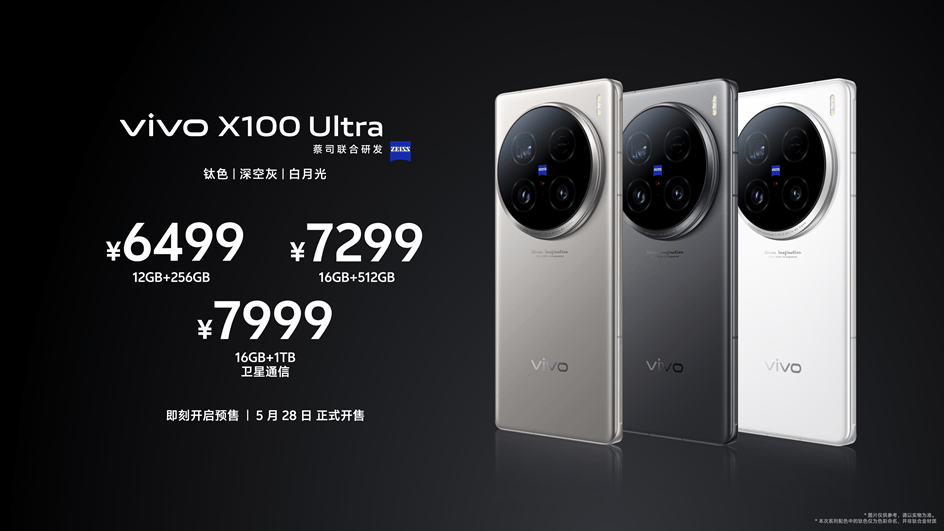 vivo已经连续三年稳坐国产手机销量第一。今年Q1,vivo持续保持了第一成绩,满分旗舰X100系列功不可没。在vivo X100、vivo X100 Pro持续热销收获好口碑之时,vivo此次升级发布了vivo X100s、vivo X100s Pro和vivo X100 Ultra三款新品。作为vivo史上首个Ultra,vivo X100 Ultra搭载蔡司2亿APO超级长焦和一英寸云台级主摄,不断拉高移动影像标准。vivo X100s凭借7.80mm超薄直屏设计、旗舰级影像体验及天玑9300+强悍性能支持,成为2024年直屏旗舰新代表。全新发布的vivo X100s共有青云、钛色 、白月光、深空灰四款配色,起售价3999元;vivo X100s Pro共有钛色、白月光、辰夜黑三款配色,起售价4999元;两款新品将于5月17日正式发售。vivo X100 Ultra共有钛色、白月光、深空灰三款配色,起售价6499元,将于5月28日正式发售。