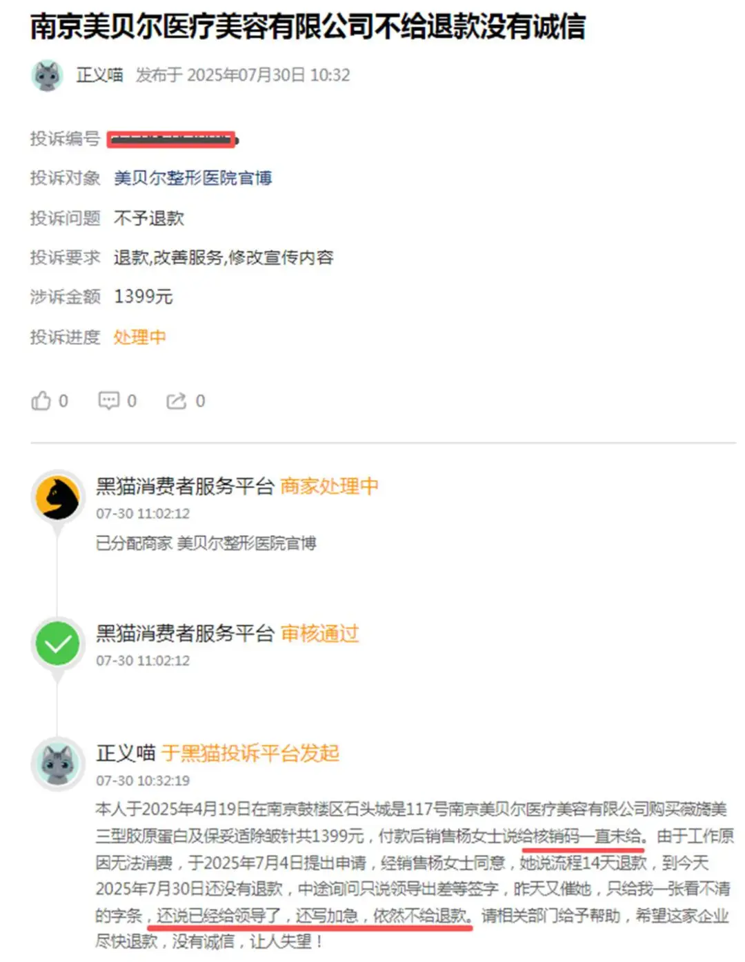 2025年4月19日,消费者在花费1399元购买了除皱针,付款后南京美贝却迟迟不给核销码。直到当消费者提出退款,院方竟以14天退款流程、领导出差等签字为由,持续推延退款,让维权成了一场笑话。