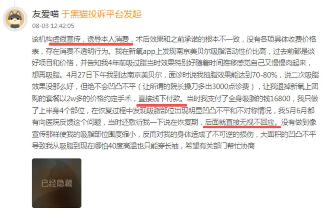 又有消费者在新氧APP被南京美贝尔高性价比吸脂广告吸引,线上谈好项目与价格,到院后却被改以“院长操刀、效果可达七八成且绝不凹凸”话术诱导退掉团购,线下加价至2万多元,并一次性收取全身吸脂款16800元,实际只做了上半身4个部位。