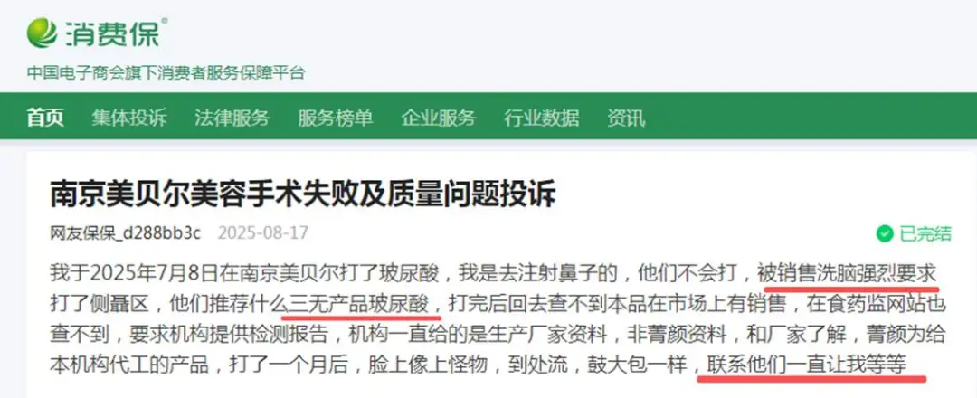 2025年7月8日,消费保上一位顾客无奈表示,在南京美贝尔本想打鼻子,却被销售的洗脑下,将玻尿酸改打在了侧聂区,事后发现这款玻尿酸在药监网无法查询。