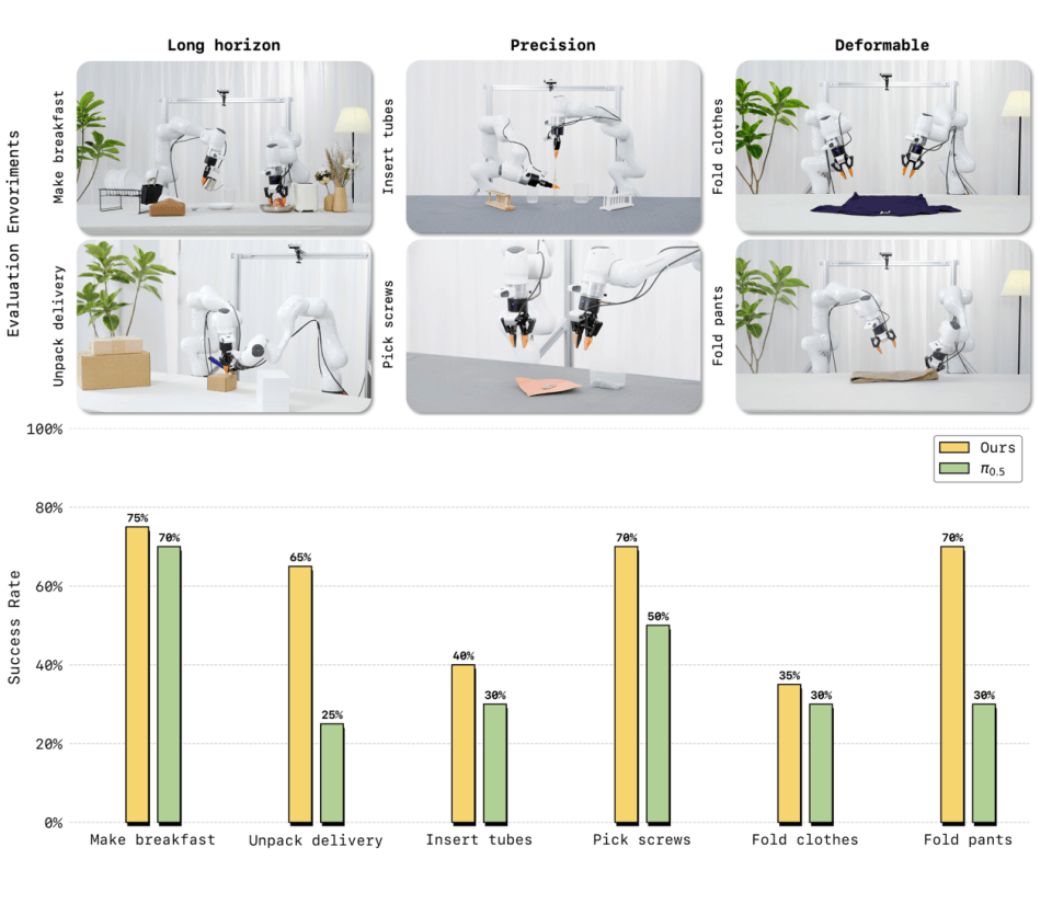 (图说:真机评测中,LingBot-VA在多项高难操作任务上性能超越业界标杆 Pi0.5)