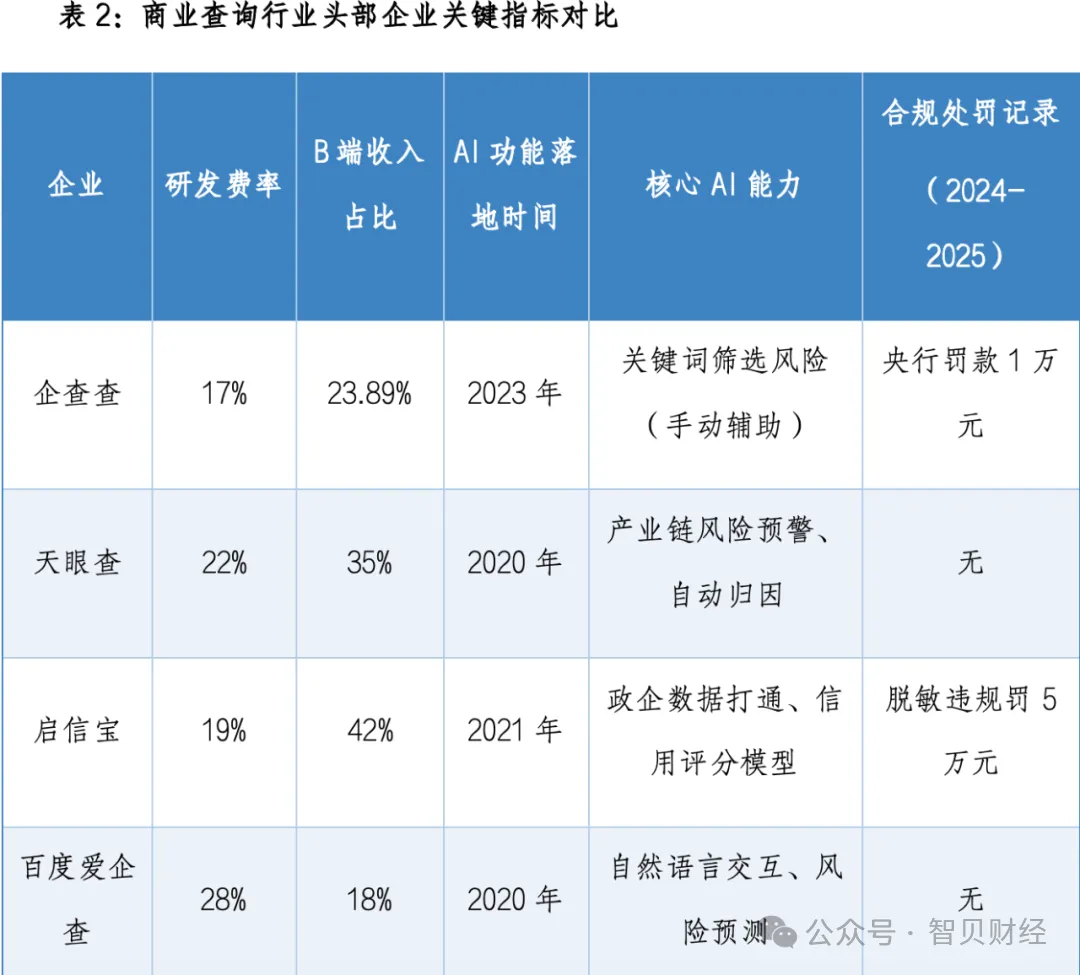 企查查的技术布局却明显滞后。据招股书披露,其2024-2025年研发费率为17%,低于天眼查的22%、百度爱企查的28%;B端收入占比仅23.89%,且近六成来自中小企业轻量化服务,缺乏高粘性标杆客户——对比来看,启信宝B端收入占比达42%,天眼查为35%。