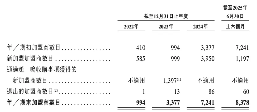 截至2022年、2023年和2024年末以及2025年6月末,鸣鸣很忙分别拥有1,898家、6,569家、14,379家和16,759家加盟店,占门店总数的绝大部分。同期内,加盟店贡献的收入额分别为42.43亿元、102.00亿元、388.88亿元和278.05亿元,分别占相关年度总收入的99.0%、99.1%、98.8%和98.9%。