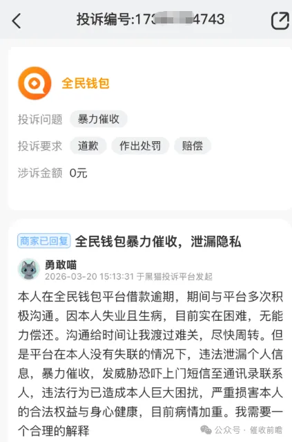 当借款逾期遇上失业、疾病、投资失利,暂时无力偿还的借款人,本应得到合理协商与合规催收,却频频遭遇爆通讯录、威胁恐吓、泄露隐私的暴力催收。2026 年 3 月,黑猫投诉平台集中出现多起针对全民钱包的暴力催收投诉,涉事主体广州市全民钱包科技有限公司,这家注册资本 2 亿元、规模超 380 人的科技企业,正深陷催收合规危机,引发公众对消费信贷行业催收底线的强烈质疑。