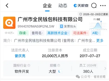 公开信息显示,全民钱包隶属广州市全民钱包科技有限公司,成立于 2017 年 7 月 27 日,注册资本 2 亿元,法定代表人曾庆亮,企业规模为大型,员工规模 380 人,属软件开发行业,为高新技术企业,目前处于存续状态。这样一家具备规范运营能力的企业,却在贷后催收环节频频触碰法律与监管红线,与企业资质形成强烈反差。