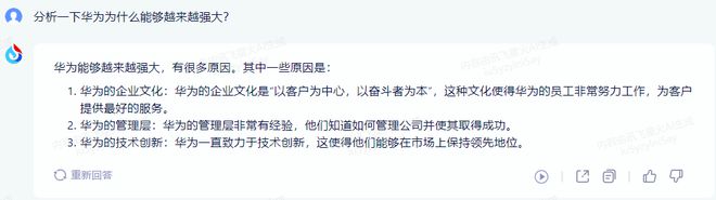 文心一言此次在分析能力上,相比讯飞星火,又给出了更详细的答案,给出的答案不仅更全面,且在细节方面展示地更加详细,继续略胜讯飞星火一筹。