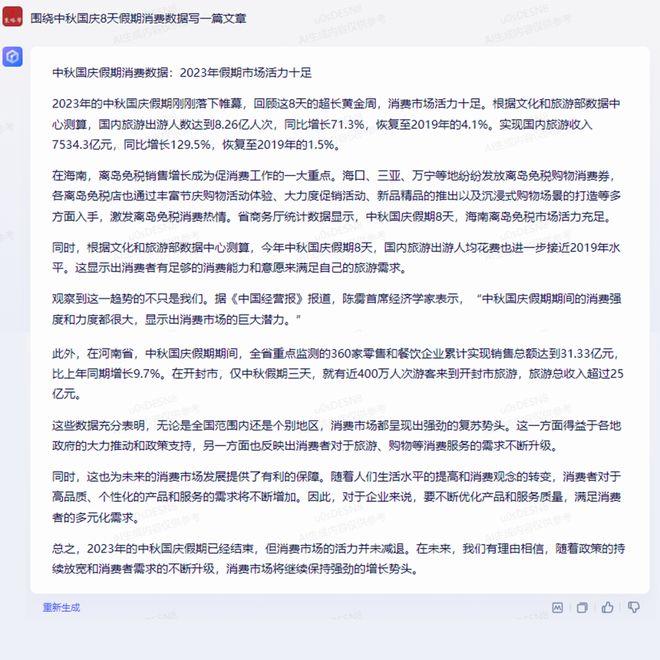 不同先前,文心一言此次在写作上,做到了紧贴主题,写出了一篇较为完整的新闻报道文章,并且给出了详细的准确数据。