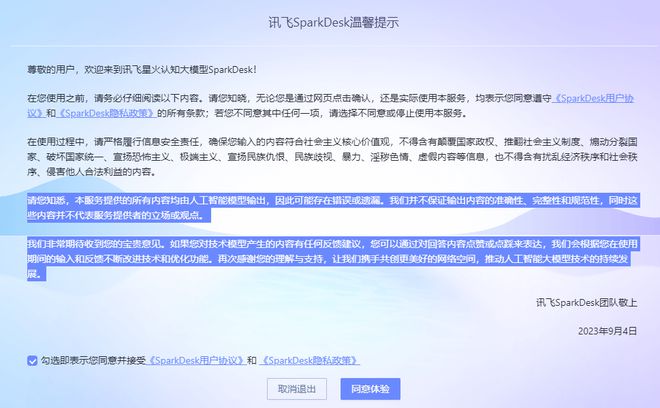 花朵财经在刚体验讯飞星火时,还收到了其温馨提示称:“本服务提供的所有内容均由人工智能模型输出,因此可能存在错误或遗漏。我们并不保证输出内容的准确性、完整性和规范性。”