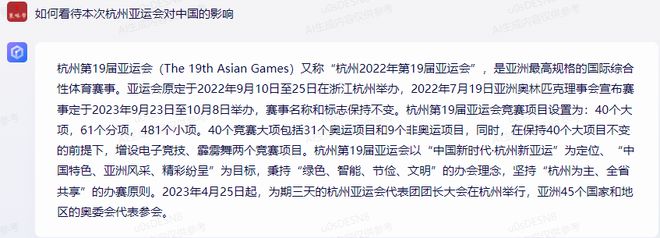 文心一言在解答此问题上,明显有些跑题,只是简单介绍了杭州亚运举办的背景。