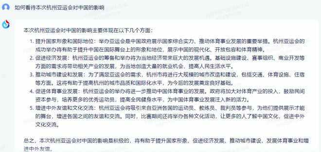 相较而言,讯飞星火给出的答案则较为详细,紧贴主题的回答了本次杭州亚运会对中国的影响。