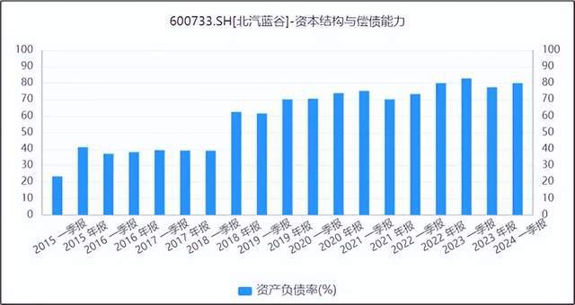 自2018年以来,北汽蓝谷的资产负债率直线上升。截至2024年一季度,已近80%。但不同于股权融资,债务融资讲的是——有借有还。然而,随着公司产品销量不佳,公司持续亏损,北汽蓝谷的偿债能力略显尴尬。