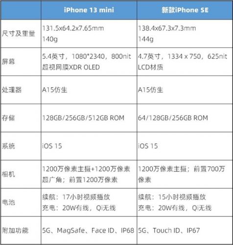 最后,在进行终极二选一之前,我们还是先回顾一下 iPhone 13 mini和新款iPhone SE的具体售价和配置情况。