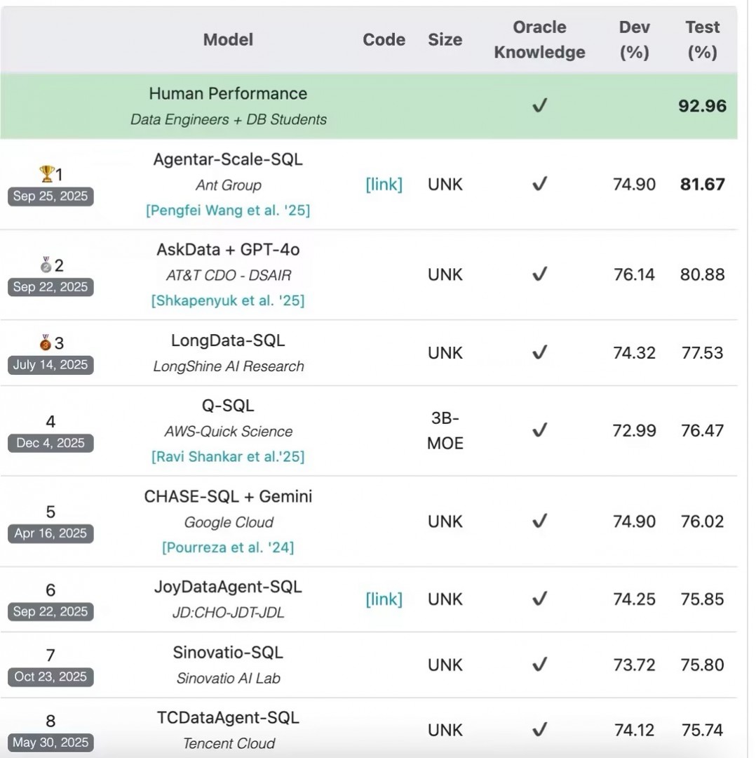 今年9月25日,由该技术支持的蚂蚁数科数据分析智能体Agentar-Scale-SQL登顶全球最具权威性的自然语言转结构化查询语言(NL2SQL)评测基准BIRD-SQL,超越Google等诸多国内外厂商。目前,该智能体仍在执行准确率排行榜以及执行效率榜保持双榜第一,已持续领跑超两月。 BIRD-SQL要求AI模型将自然语言查询转换为SQL,并且在真实复杂的大规模生产级数据库中稳定执行。其数据集覆盖金融、电力、医疗等37个真实行业场景,总量33GB,包含超过1万条高复杂度查询任务,被认为是全球最难的NL2SQL测试。