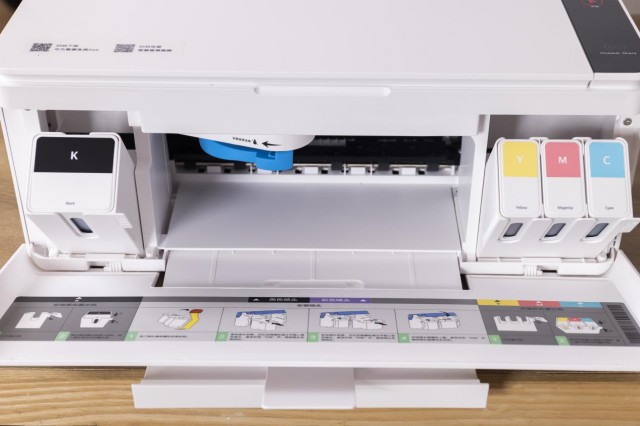 而其安装方法也非常简单直观,打开打印机的前盖,我们就可以看到详细直观的安装示意图,即使没有什么安装经验的数码小白,也能根据示意图轻松完成,此后打开电源即可开始打印操作。