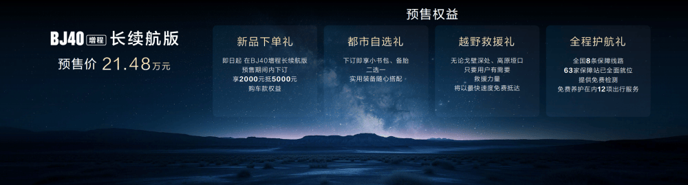 BJ40增程长续航版预售价为21.48万元,现在下订享四大预售权益:第一,新品下单礼。预售期内下订,享2000元抵5000元购车款权益。第二,都市自选礼。下订即享小书包、备胎二选一,实用装备随心搭配。第三,越野救援礼。无论戈壁深处、高原垭口,只要用户有需要,救援力量将以最快速度免费抵达。第四,全程护航礼。全国8条保障线路、63家保障站已全面就位,提供免费检测、免费养护在内12项出行服务。