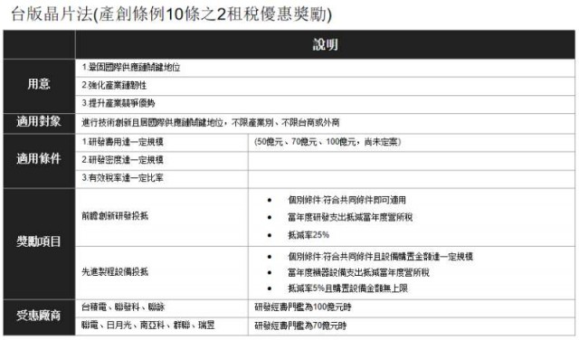 而且,这一法案宣称“无差距对待”,针对在中国台湾进行技术创新、且位居国际供应链关键地位的公司,不限相关产业类别,不限台商或外商。