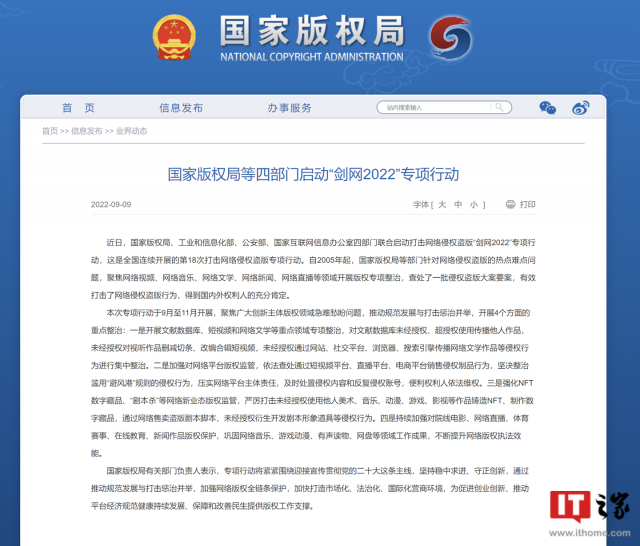 9 月 9 日消息,据国家版权局网站,近日,国家版权局、工业和信息化部、公安部、国家互联网信息办公室四部门联合启动打击网络侵权盗版“剑网 2022”专项行动,这是全国连续开展的第 18 次打击网络侵权盗版专项行动。