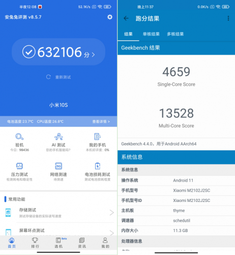 笔者先后对其进行了安兔兔和GeekBench4跑分测试,其中安兔兔成绩达到了632106分,GeekBench单核得分4659,多核得分13528,以上成绩虽然比骁龙888要差一些,但这也已经是目前旗舰手机的不错表现了。