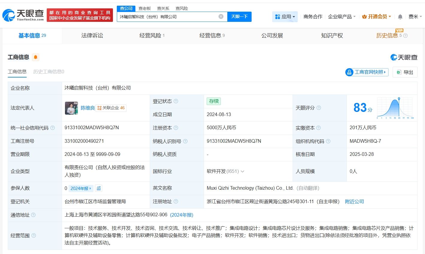沐曦集成电路(杭州)有限公司、沐曦启智科技(台州)有限公司分别成立于2020年12月、2024年8月,法定代表人均为陈维良,注册资本分别为2500万人民币、5000万人民币,经营范围包括集成电路设计、软件开发、软件销售等,均由沐曦股份(688802)全资持股。