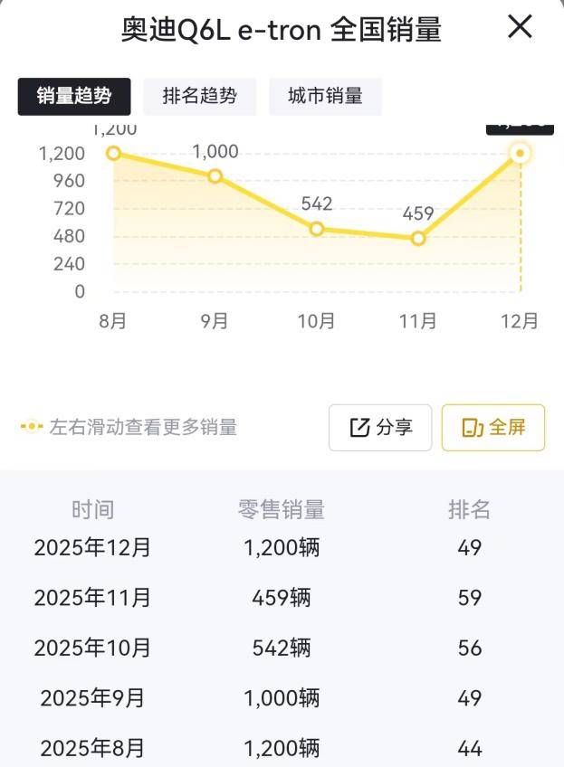 从市场表现来看,奥迪Q6L e-tron自上市以来的销量也十分惨淡。懂车帝的数据显示,8月至12月的销量分别为1200辆、1000辆、542辆、459辆和1200辆,这样的销量数据在竞争激烈的新能源市场中几乎可以忽略不计,也充分暴露了一汽奥迪在电动化领域的困境。