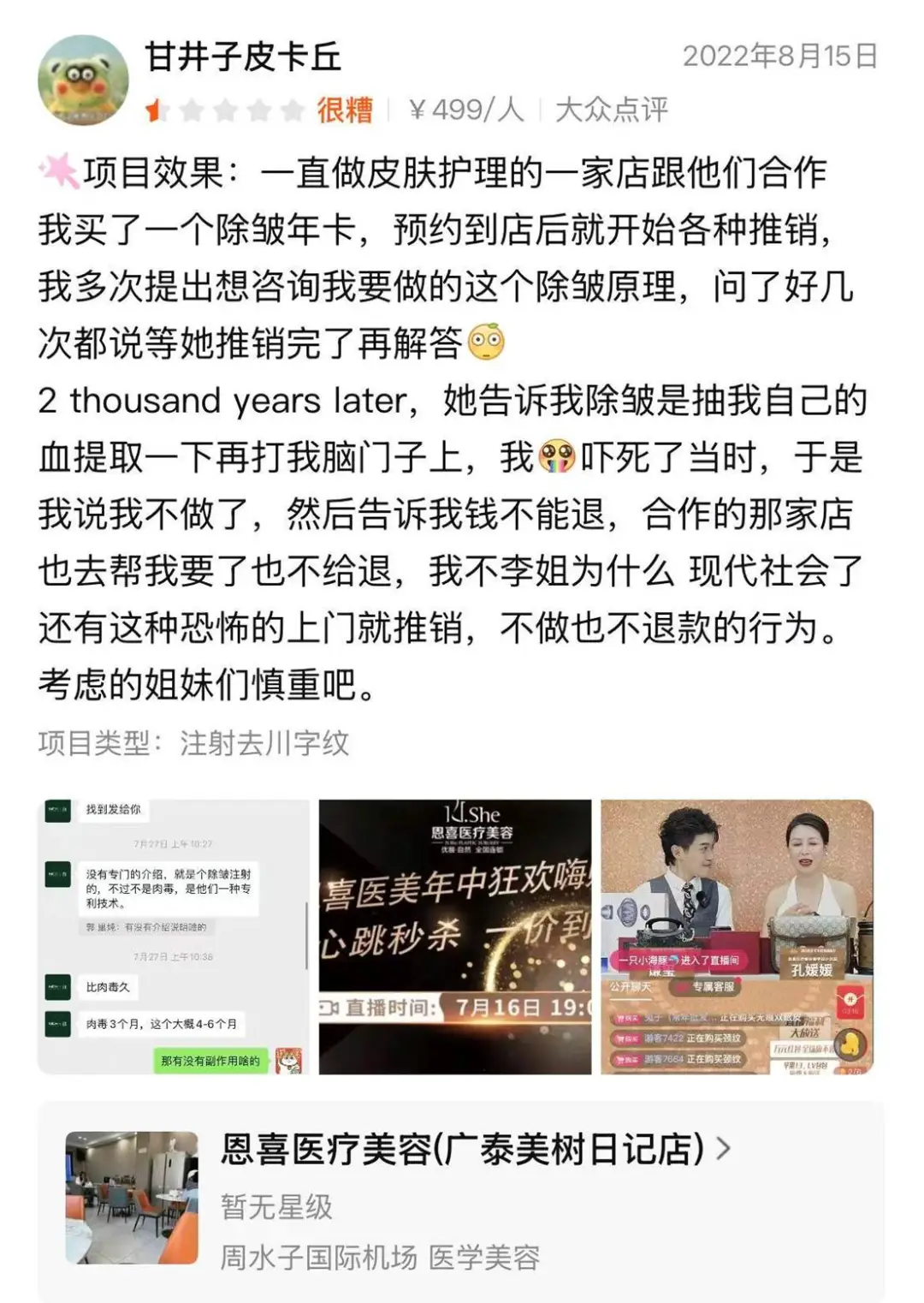 在大众点评上,一位消费者愤怒地分享道:原想在大连恩喜合作的皮肤护理店做除皱年卡,到店却被连环推销,连问四五次用什么原理除皱,都被工作人员一句“等我先介绍完”挡回。