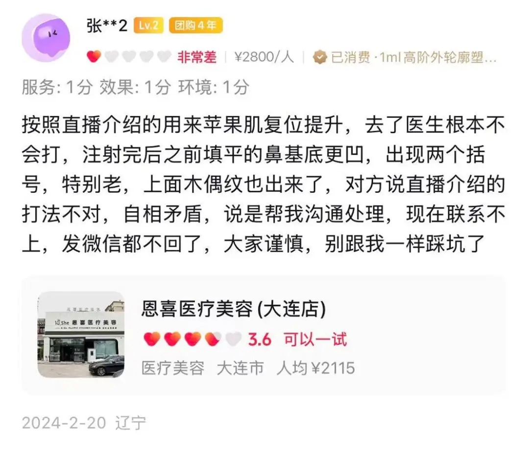 打开抖音,相关的吐槽视频更是数不胜数。一位抖音用户亲身经历后,在评论区中无奈地表示:“一开始是冲着大连恩喜直播承诺的“苹果肌复位提升”去的,结果医生根本不会同款打法,胡乱注射后鼻基底反而塌陷出两道“括号纹”,木偶纹也被拉出来,瞬间显老十岁。
