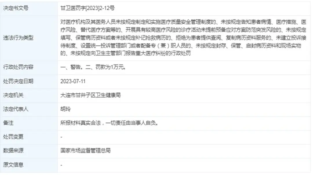 2023年7月11日,大连恩喜医美因存在多项严重违法违规行为,包括未按规定实施医疗安全、未充分告知风险、未备高风险预案、病历管理混乱且拒患者复印,被相关部门处以警告并罚1万元。
