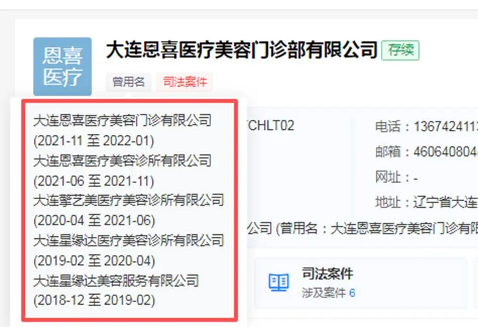 随后,它又摇身一变,成为大连擎艺美医疗美容诊所有限公司。可即便如此,差评与纠纷并未消退。为求转机,它再次更名,成了大连恩喜医疗美容诊所有限公司,接着又迅速变更为大连恩喜医疗美容门诊有限公司,最终定格为“大连恩喜医疗美容门诊部有限公司。”