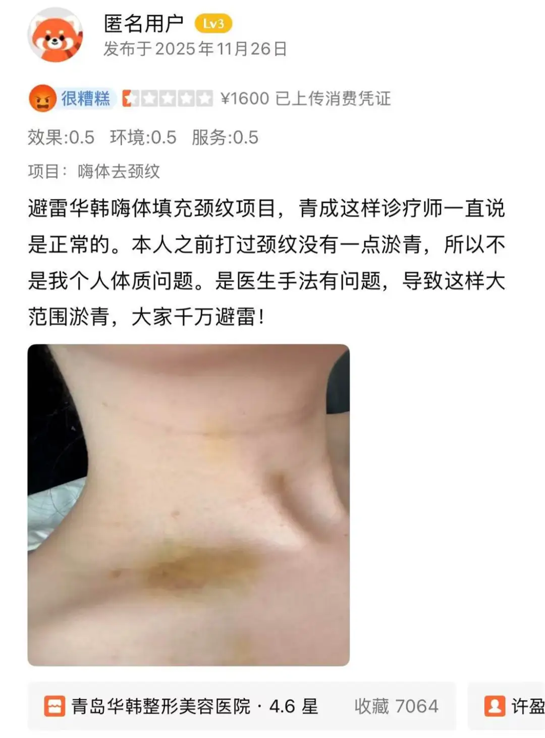 在大众点评上,一位消费者分享了自己在青岛华韩整形做嗨体填充颈纹项目的糟糕经历:“我接受该项目后出现大面积淤青情况,而医生却一直坚称这是正常现象。我之前也做过颈纹相关项目,当时根本没有出现一点淤青,所以我很确定不是我自身体质问题,而是医生手法存在严重问题才导致如此大范围淤青,大家千万要避雷这家医院。”