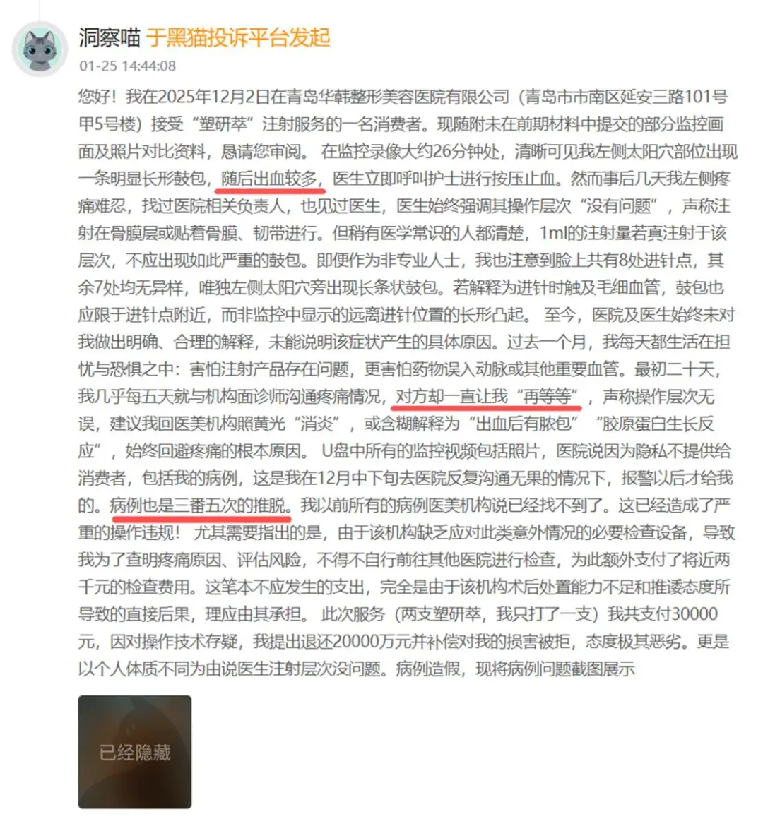 据该消费者描述:“2025年12月2日,我在青岛华韩整形接受塑研萃注射项目(共购买两支,实际仅注射一支,支付费用3万元)。术中,左侧太阳穴部位突然出现一条明显的长形鼓包,并伴随较多出血,医生立即呼叫护士进行按压止血。