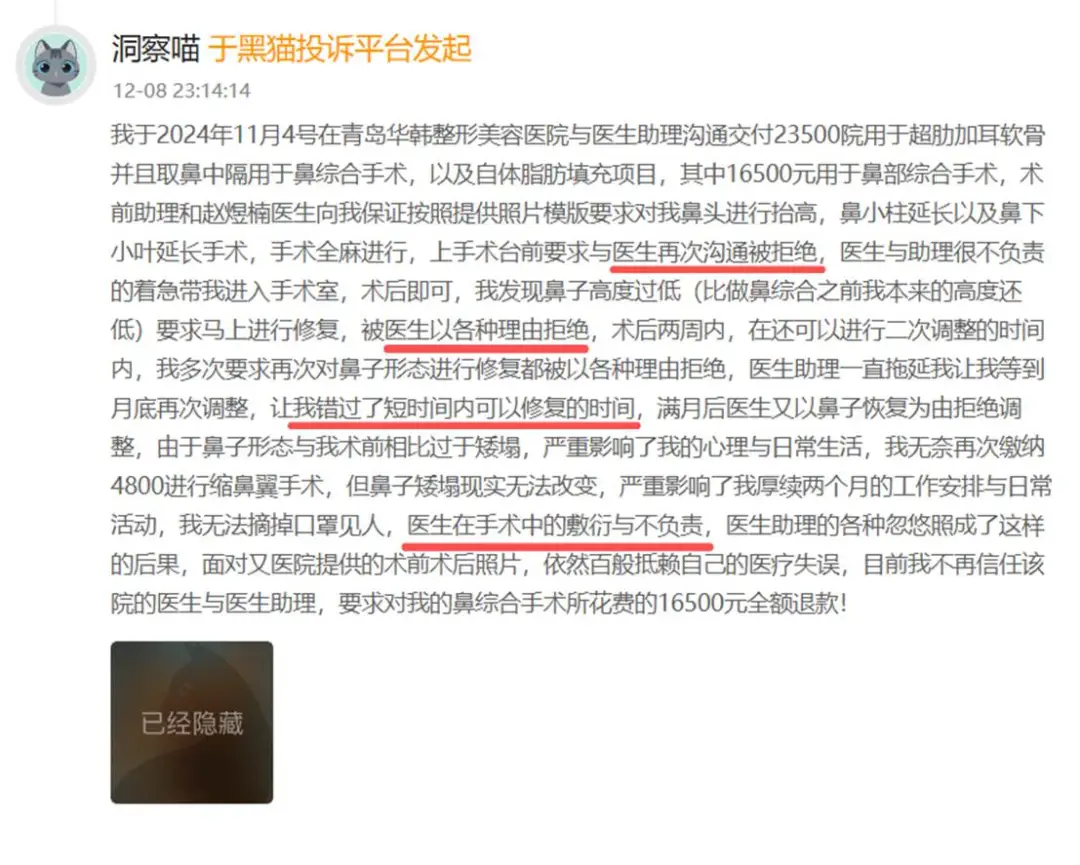 隆鼻手术失败的投诉也屡见不鲜。有消费者说:“2024年11月4日,我在青岛华韩整形美容医院支付23500元做超肋加耳软骨以及取鼻中隔进行鼻综合手术和自体脂肪填充项目,其中16500元用于鼻部综合手术。