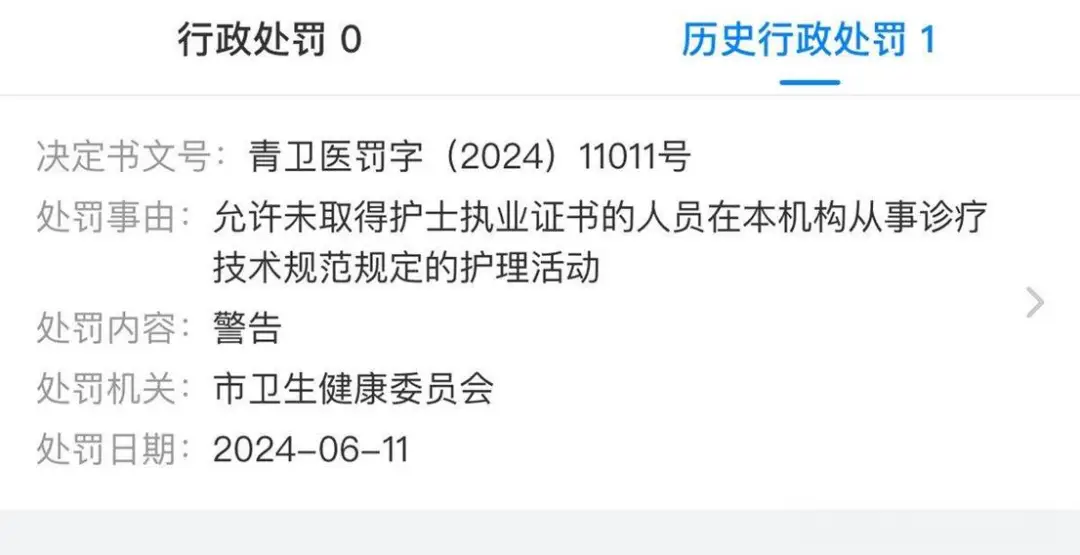 2024年6月,它又因允许未取得护士执业证书的人员,从事诊疗技术规范规定的护理活动被查处。