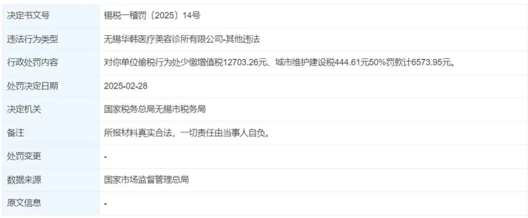 2025年2月28日,华韩医疗旗下的无锡华韩医疗美容诊所有限公司因偷税行为被相关部门处罚。