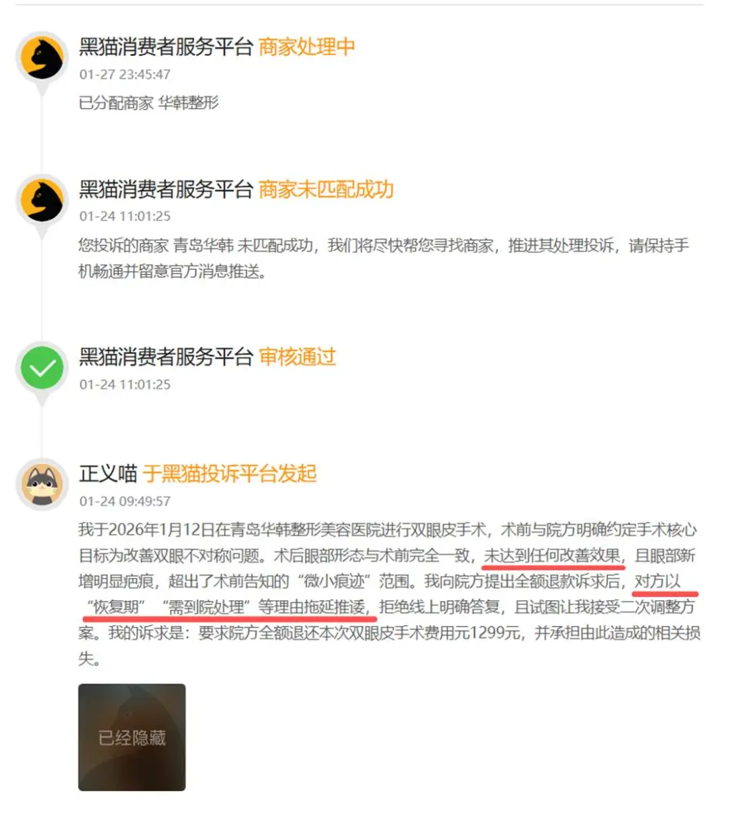 2026年01月25日,一位消费者在黑猫投诉上爆料青岛华韩整形出现医疗事故。