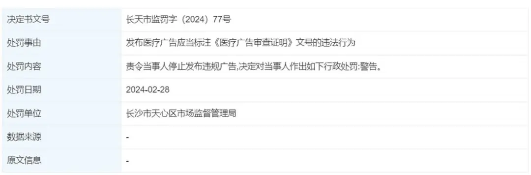 2024年2月28日,华韩医疗旗下的长沙华韩医疗美容有限公司因违规发布医疗广告被罚。