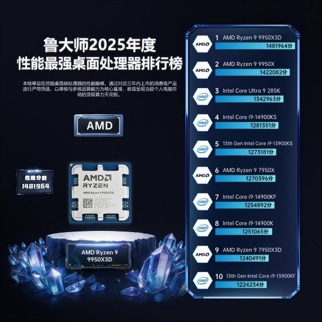 AMD Ryzen 9 9950X3D 荣获“2025年度性能最强桌面处理器”。依托第二代 3D V-Cache 技术带来的 144MB 超大缓存,其在高帧电竞与专业生产力双赛道同时拉满上限:游戏端轻松突破千帧,创作端则以更稳定的吞吐能力建立优势,代表了桌面平台性能天花板的最新高度。