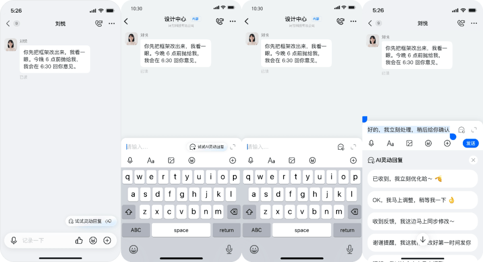AI可以基于当前聊天对话的上下文,识别用户与对话对象的身份及组织关系,自动生成4-6条涵盖简洁、专业、主动确认、轻松活泼等多种语言风格、不同语气口吻的回复建议。用户可在此基础上再次编辑后发送,既保持个性表达,又大幅降低组织措辞的时间成本。