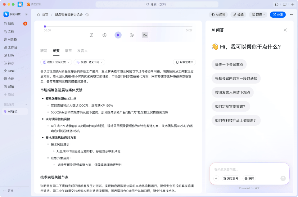 在学习、面试、项目沟通、销售拜访、咨询时,钉钉用户都可以在AI听记的转写纪要详情页面,使用AI问答功能,与AI协作完成具体的工作,实现效率提升,不再需要翻找原文。