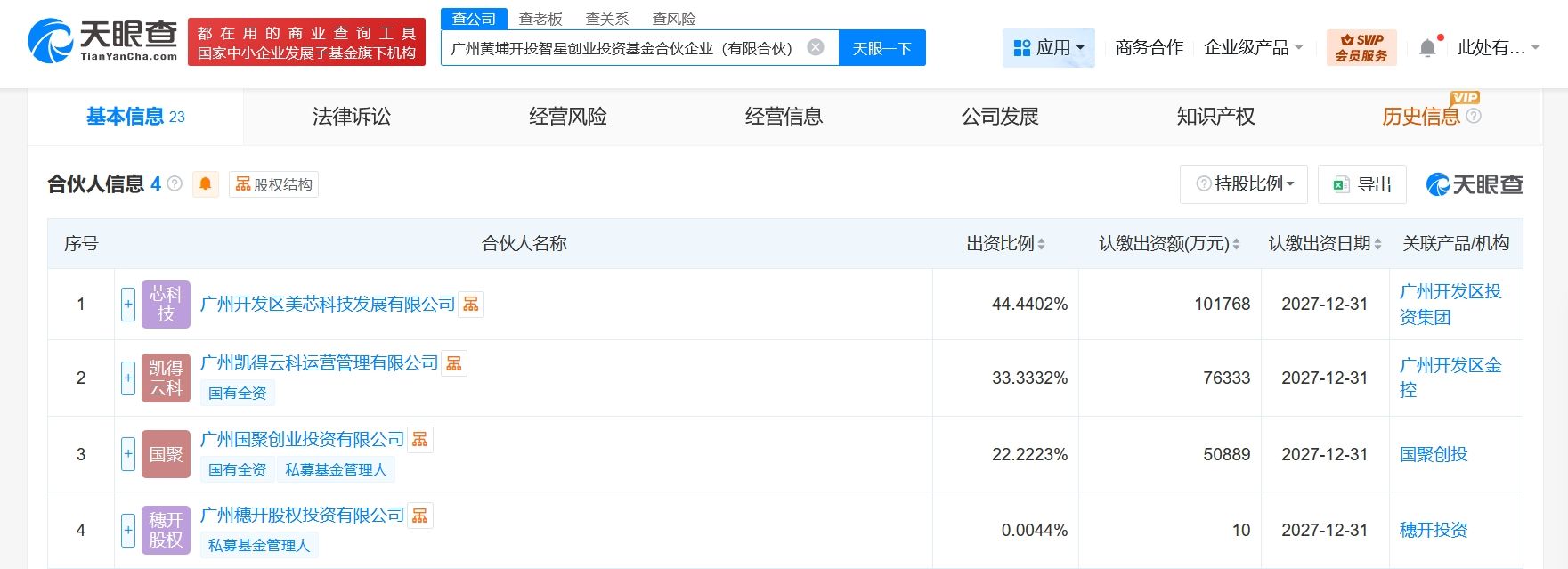 天眼查App显示,近日,广州黄埔开投智星创业投资基金合伙企业(有限合伙)成立,执行事务合伙人为广州穗开股权投资有限公司,出资额22.9亿人民币,经营范围为以自有资金从事投资活动,创业投资,以私募基金从事股权投资、投资管理、资产管理等活动。合伙人信息显示,该基金由广州开发区美芯科技发展有限公司、广州凯得云科运营管理有限公司、广州国聚创业投资有限公司、广州穗开股权投资有限公司共同出资。
