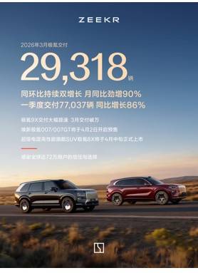 今日,极氪发布2026年3月交付成绩单。数据显示,极氪3月交付新车29318辆,同比增长90%,环比增长23%,成为主流新势力中唯一近两个月连续实现同环比双增长的品牌。今年一季度,极氪累计交付 77,037辆,同比提升86%。 截至目前,极氪全球累计交付近72万辆,进一步夯实了其在高端豪华新能源汽车市场的领先地位。