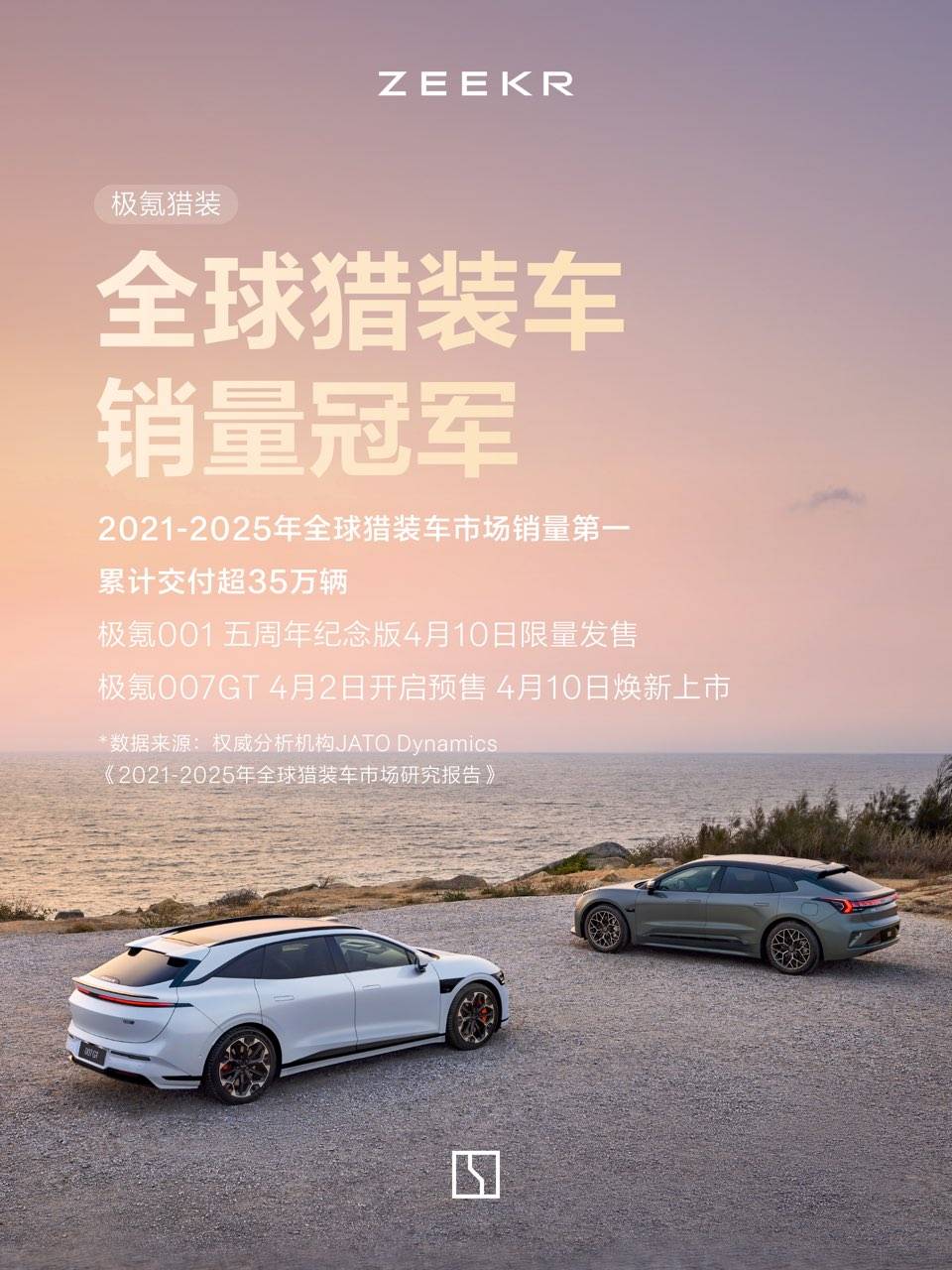 此外,由极氪007、007GT组成的焕新7系即将于4月10日上市,同时在品牌五周年之际特别推出的定制款——极氪001五周年纪念版也将限量发售。据悉,极氪焕新7系将全系标配700 TOPS算力的Thor-U芯片,并升级900V高压架构,最高续航达905公里,零百加速最快2.73秒。据第三方权威机构统计,目前极氪猎装车型销量累计超35万辆,占据全球猎装车市场七成份额。