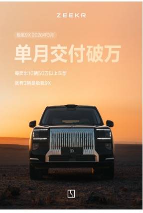 其中,极氪9X 3月交付量破万,这款基于浩瀚-S超级电混架构打造的豪华旗舰,此前已连续四月蝉联50万级大型SUV销冠,平均成交价超53万元,如今中国市场每卖出10辆50万以上车型,就有3辆是极氪9X。源于供应链核心零部件产能提升,极氪9X交付大幅加速。极氪App显示,9X的Max/Ultra版下单提车仅需1-6周,Hyper/曜黑版交付已提速至8-12周。