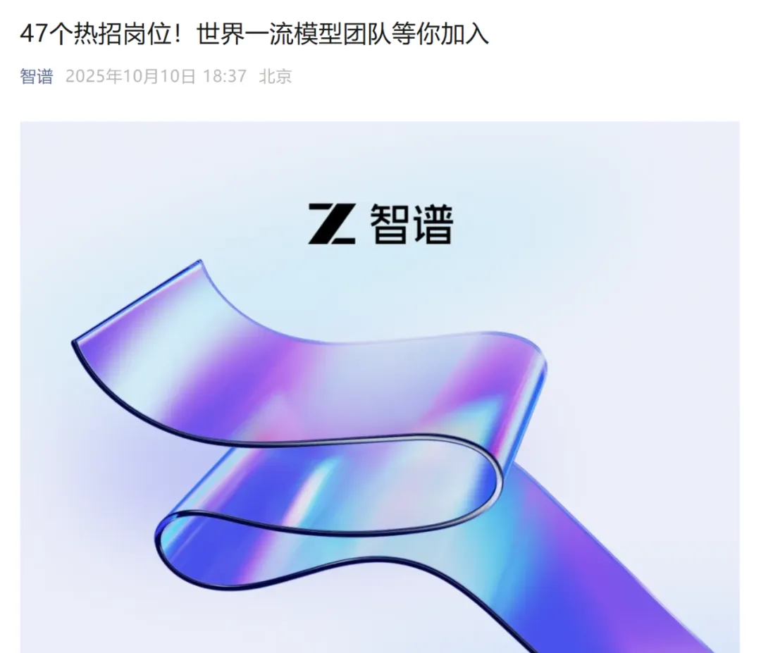 10月10日晚间,智谱还在公司的官方公众号中发布了一条招聘推送。推送显示目前智谱正在招聘47个岗位,岗位包括算法工程师、推理优化工程师、Agent产品经理等等。