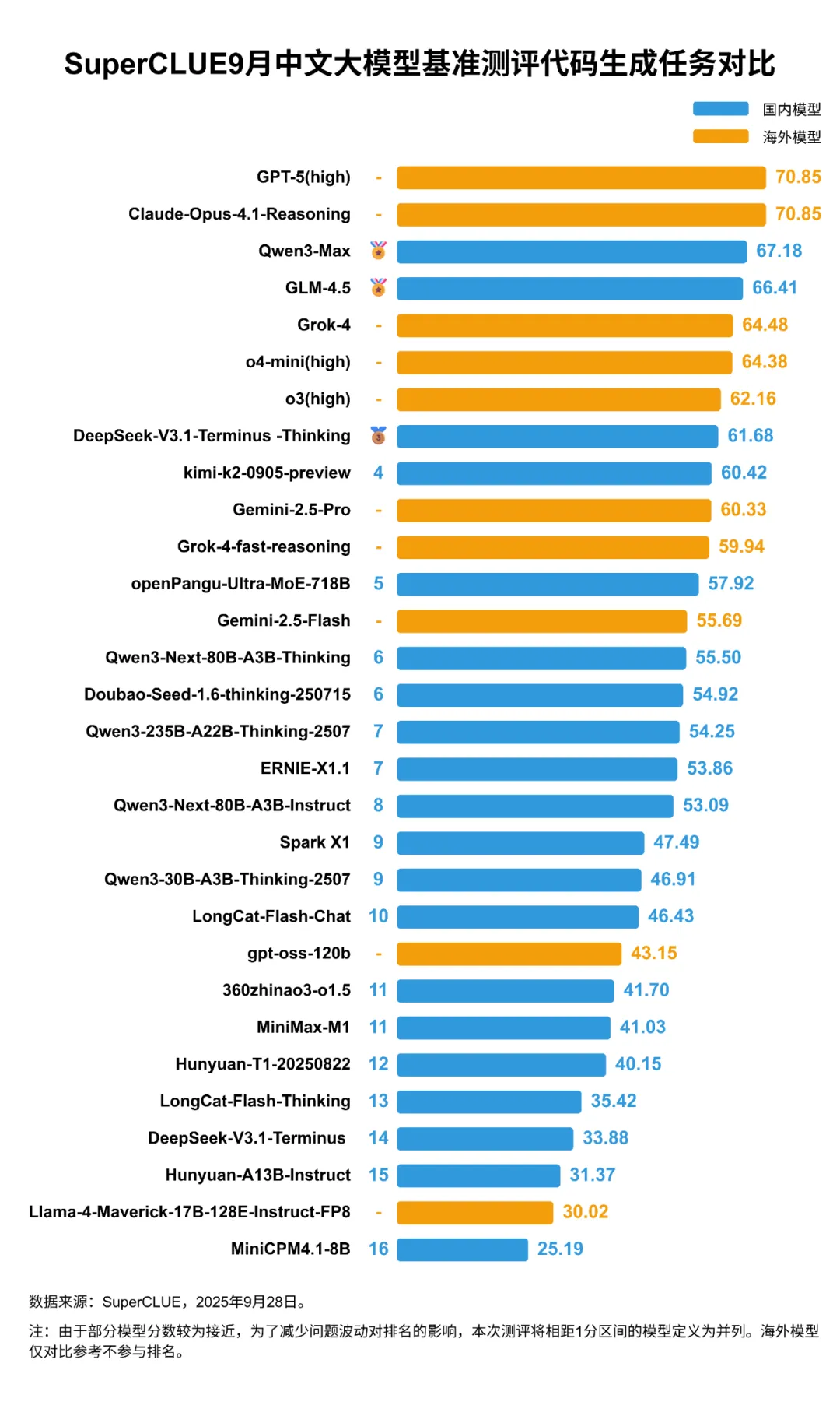 从模型能力上看,智谱也存在部分短板。据SuperCLUE发布的数据,今年9月,智谱旗下的GLM-4.5在代码生成、科学推理这两项指标方面表现较好,均能排在国内模型中前5名的位置。