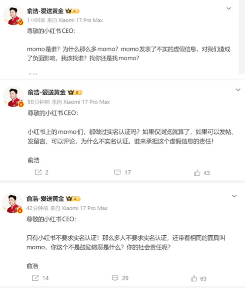 紧接着,俞浩将矛头对准了平台的底线机制——实名认证。他质问小红书,这些活跃在发帖、留言、评论一线的“momo”账号,是否真正落实了实名制?如果账号可以随意发声却隐匿在默认ID背后,虚假信息发布的责任界定便成了一纸空文。