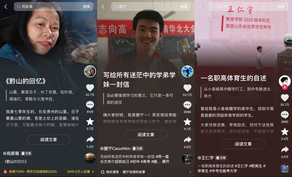 此外,还有更多素人发布的长图文在抖音出圈。出生于1970年的@祝薪雁 在《黔山的回忆》一文中回忆了自己在贵州大山的童年经历,获得了抖音网友32万次点赞。北大在读博士、知识创作者@圈宁CeoxNim 通过长图文《给所有迷茫中的学弟学妹一封信》传达学习感悟,大批学子在评论区互动。体育生@王仁宇 在《一名职高体育生的自述》中讲述了自己从职高生逆袭到北京体育大学的经历,带动评论区网友投稿讲述自己的故事。