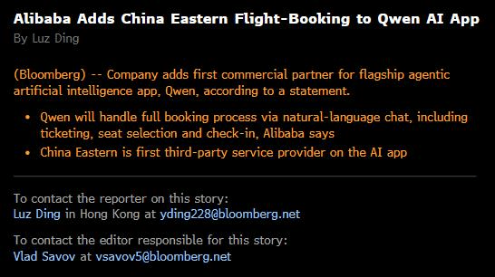 彭博社:阿里巴巴旗下AI助手千问首次开放Agent技术 接入东方航空观点